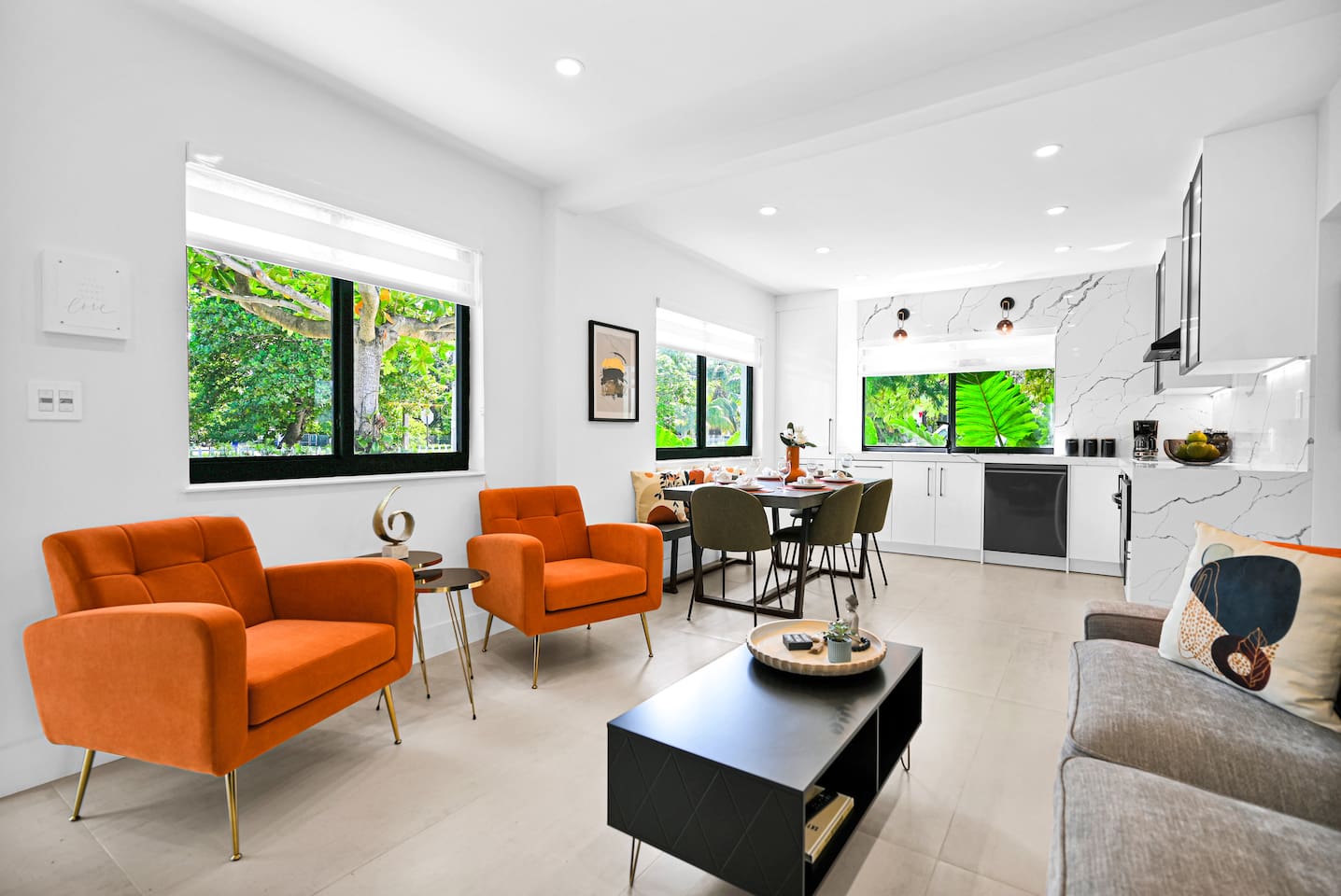 Bedroom Configuration ➞ 2 Bedrooms with plush queen-size beds, hotel-quality linens, and pillows for ultimate comfort ➞ Sleeps up to 4 guests Home Features ➞ Spacious Living Area: Relax on a cozy sofa after a day of exploration ➞ Dining Area: Seating for four, perfect for shared meals or work sessions ➞ Modern Bathroom: Equipped with fresh towels, shampoo, conditioner, and shower gel ➞ Fully Equipped Kitchen: Features sleek appliances and all essentials for cooking ➞ Private Backyard: The property has a shared front entry through the entrance gate. The private patio is located at the back of the house and is accessed directly through the home. ➞ High-Speed WiFi: Ideal for streaming, work, or staying connected ➞ On-Premises Parking: Private entrance for added convenience ➞ No Pets & No Smoking: Ensuring a clean, fresh environment for all guests Why You'll Love Staying Here ➞ Tranquil 2-bedroom setup with serene views of lush greenery ➞ Private garden oasis with outdoor seating for unwinding in style. ➞ Family-friendly amenities for a hassle-free stay ➞ Fast WiFi, perfect for remote work or leisure ➞ Laundry facilities and an iron with an ironing board for long stays Nearby Attractions ➞ Design District: Just steps away, this upscale neighborhood boasts high-end shopping, world-class art galleries, and trendy dining options ➞ Wynwood Walls: A short walk to Miami's iconic street art district, teeming with vibrant murals and creativity ➞ South Beach: A quick 15-minute drive to Miami's famous beaches, nightlife, and oceanfront dining ➞ Brickell City Centre: Enjoy luxury shopping and fine dining in Miami's financial hub ➞ Vizcaya Museum and Gardens: Explore Miami's historic estate, featuring stunning gardens and breathtaking waterfront views Guest Access ➞ Check-in: 4:00 PM | Check-out: 11:00 AM ➞ 24/7 messaging support for any assistance during your stay House Rules ➞ Trash Disposal: Use the designated blue and green bins located behind the unit ➞ Pets and smoking are not permitted to maintain a clean and welcoming environment ➞ Early check-in or late check-out may be available on request, subject to availability and an additional fee. ➞ Luggage drop-off is not allowed. ➞ Commercial photography and filming are not permitted on the property. Whether you're visiting for work, a family vacation, or a romantic getaway, this stylish apartment offers everything you need for a memorable Miami experience. Book now to secure your stay in the heart of Miami's most vibrant neighborhoods!